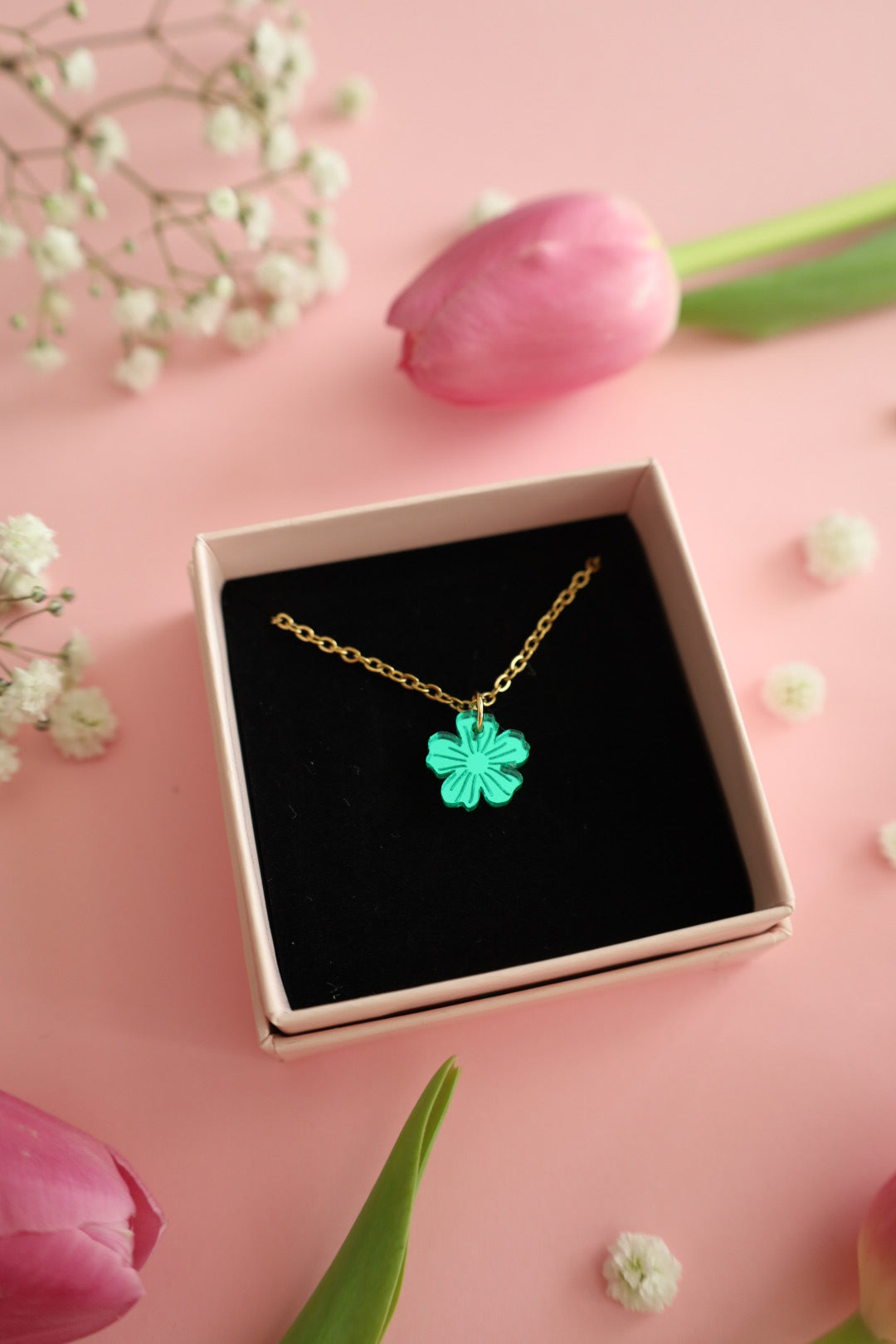Lilja -kaulakoru ihastuttaa suloisuudellaan! Kaulakoru on siro ja kevyt, joten se sopii hyvin käytettäväksi osana arkiasua. Korun riipus on säihkyvää ja kevyttä peiliakryyliä, ketju puolestaan ruostumatonta terästä. Ketjun pituus on 45cm. Metalliosat ovat nikkelitestattuja eikä niistä vapaudu nikkeliä.