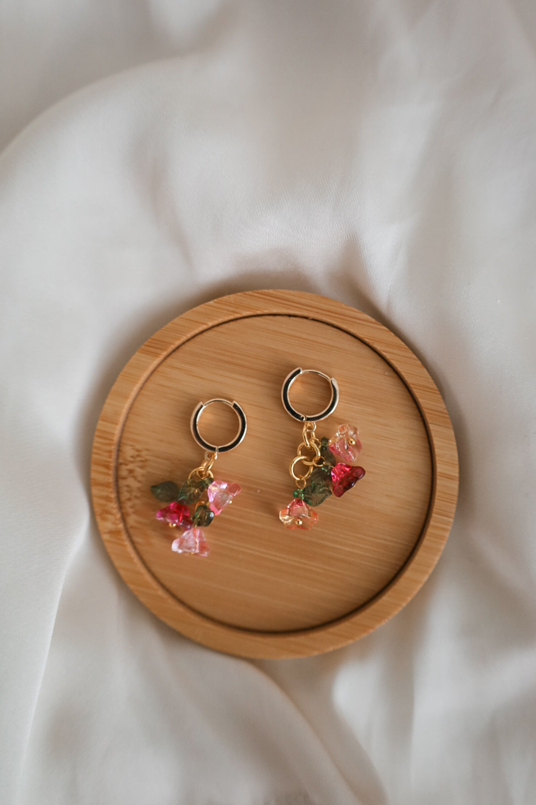Nämä upeat korvakorut syntyivät kesän ja kukkasten innoittamana. Kauniin värikkäät lasihelmet yhdistettynä kultaisiin metalliosiin muodostavat täydellisen kokonaisuuden.